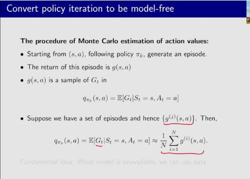 假如我们有一个g的集合,里面有很多条轨迹,那么 qπk(s, a) = E[Gt|St = s, At = a] ≈ $$\frac{1}{N} \sum_{i=1}^{N}g^{(i)}(s,a)$$