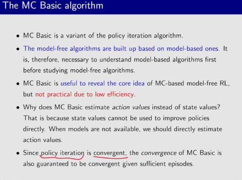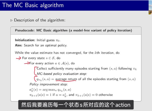 mc算法直接估计动作的价值,而非状态的价值,这是因为动作价值能够直接用于改进策略,状态价值还得转成动作价值才能改进策略