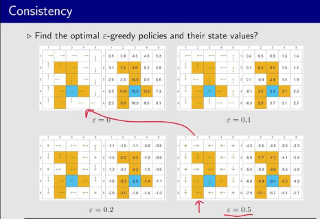 0.5的时候,epislon就和原先最优策略不能用了。这个故事告诉我们,如果要是想用epislon greedy策略,epislon不能开太大。
