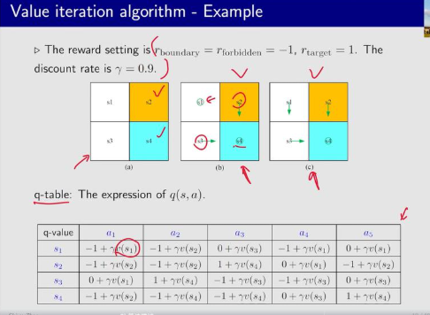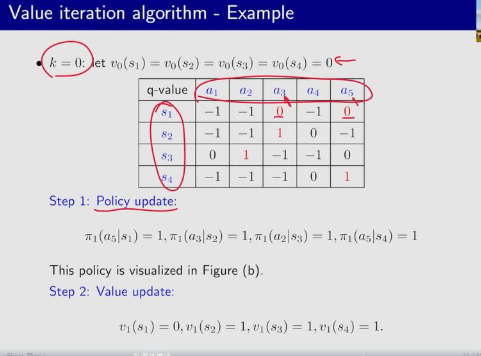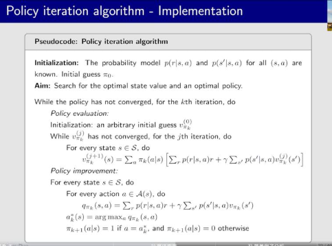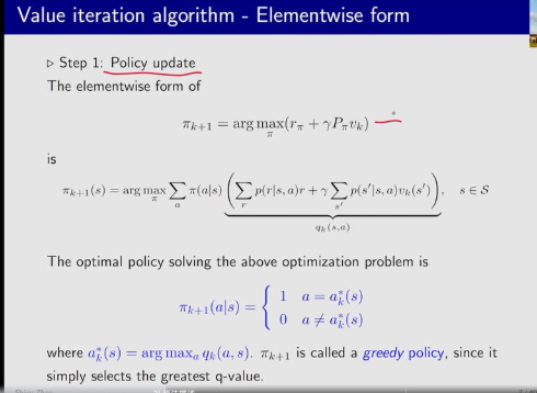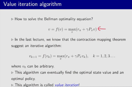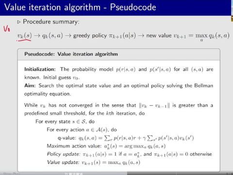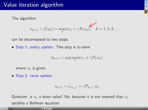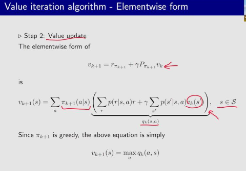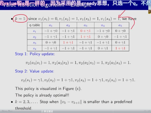 首先我们有一个vk,在vk还没收敛的时候,就通过不断的迭代,遍历所有的状态s,遍历所有状态的a,计算所有状态的qk,看哪个action对应的是最大的qk,选这个action。并且根据这种方式去更新value(已知π的情况下就可以知道r,可以迭代。)