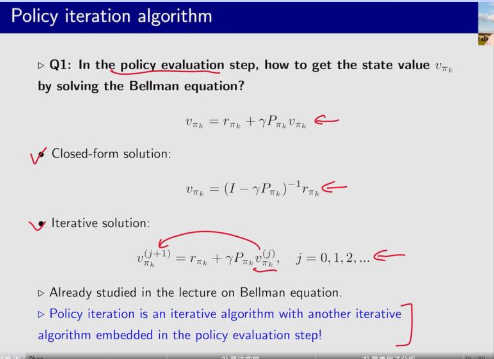 和策略迭代相关的问题 问题1,如何求解:和之前一样的两种方法,求逆和迭代。用迭代的方式去求解这个贝尔曼公式