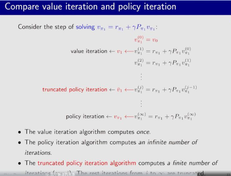 最重要的区别就在于在迭代的第四步,值迭代算法用的是v1,策略迭代算法:用的是vπ1,而vπ1又需要在π1下基于v0进行无穷多次迭代才能得到,收敛时才退出。作为对比,值迭代算法就迭代一次,直接得到下一时刻的v。说明值迭代算法只迭代1次,策略迭代算法要迭代很多次,我们由此可以想到,有没有一种迭代方法能在这两者之间进行一个折中的,所以就提出了截断策略迭代算法。