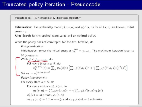 截断策略迭代算法是值迭代算法和策略迭代算法的一般化的推广,值迭代只进行1步迭代,值迭代进行有限步的迭代就是截断策略迭代,如果进行很多步,直到算法收敛(价值准确估计出来),这个就是策略迭代算法。