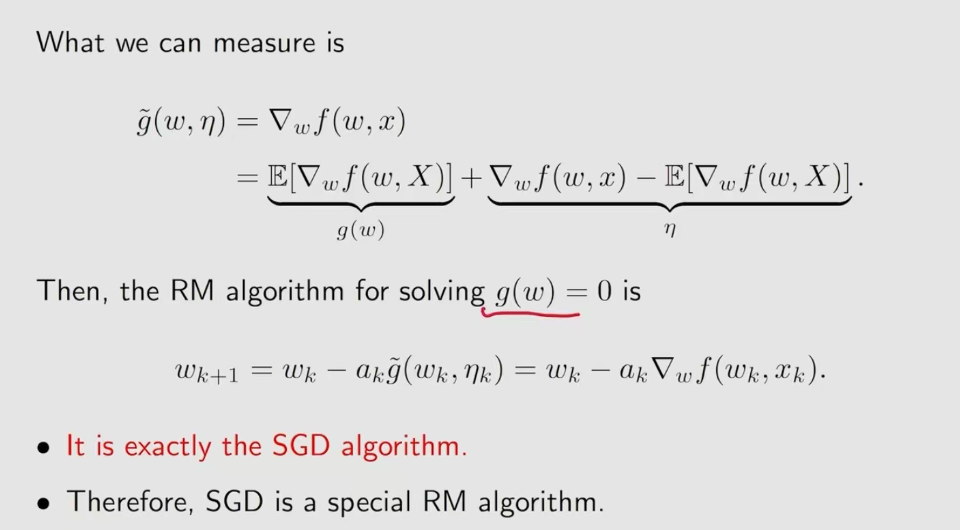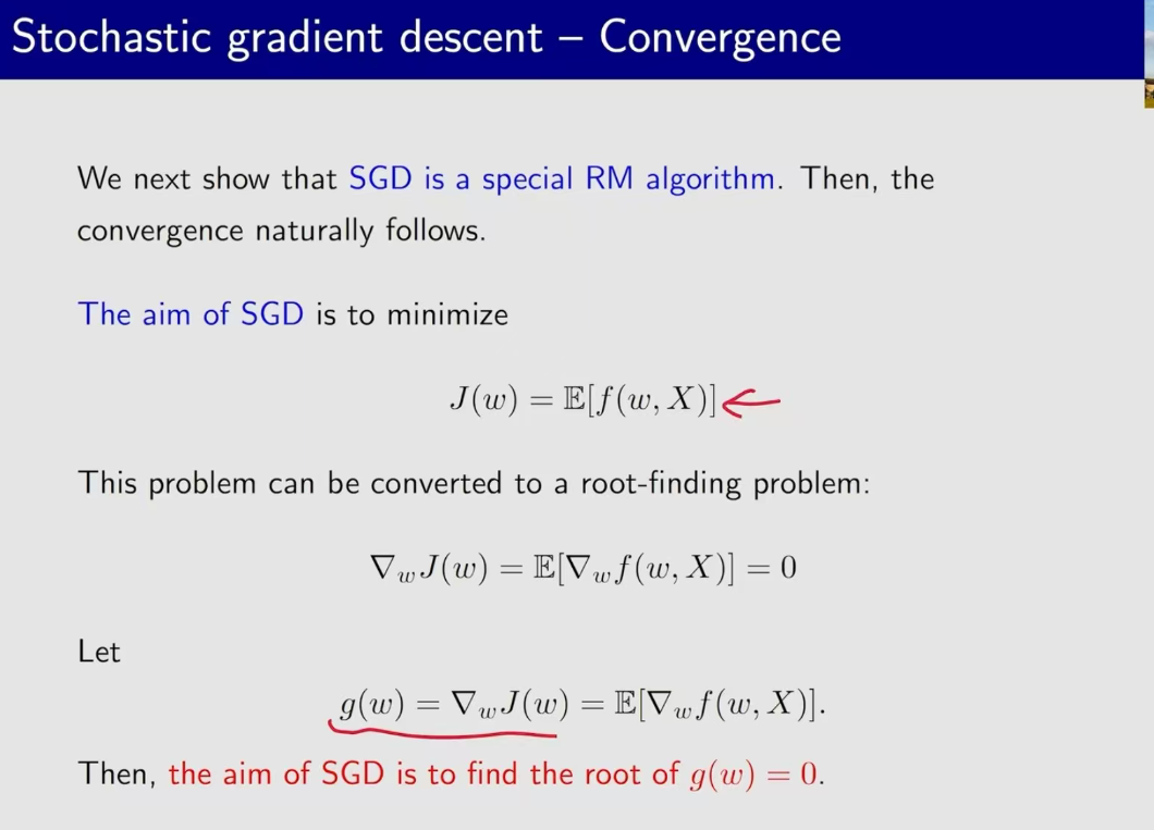 为什么sgd可以收敛呢?可以用前面讲的rm算法来证明。sgd是优化问题 ,他最终的目标是求损失函数J(w)最小,这个最小可以转化成求根问题。也就是梯度(g(w))为0的时候去求g(w)的根。