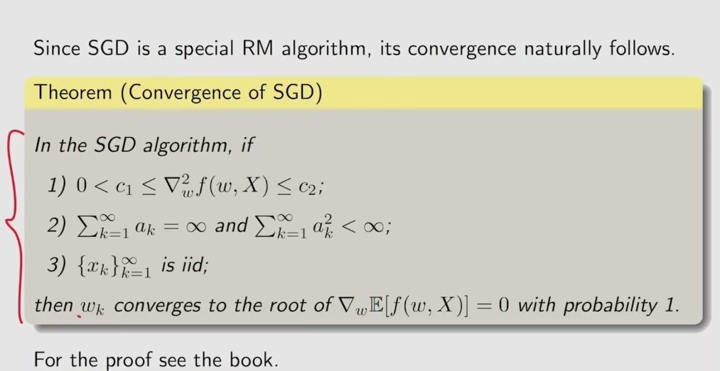 由于SGDa是特别的RM算法,它的收敛性服从下面的结论(看图)。 第一个条件是f是凸函数,且上下界是向量 第二个是收敛性 第三个是采样是独立同分布。
