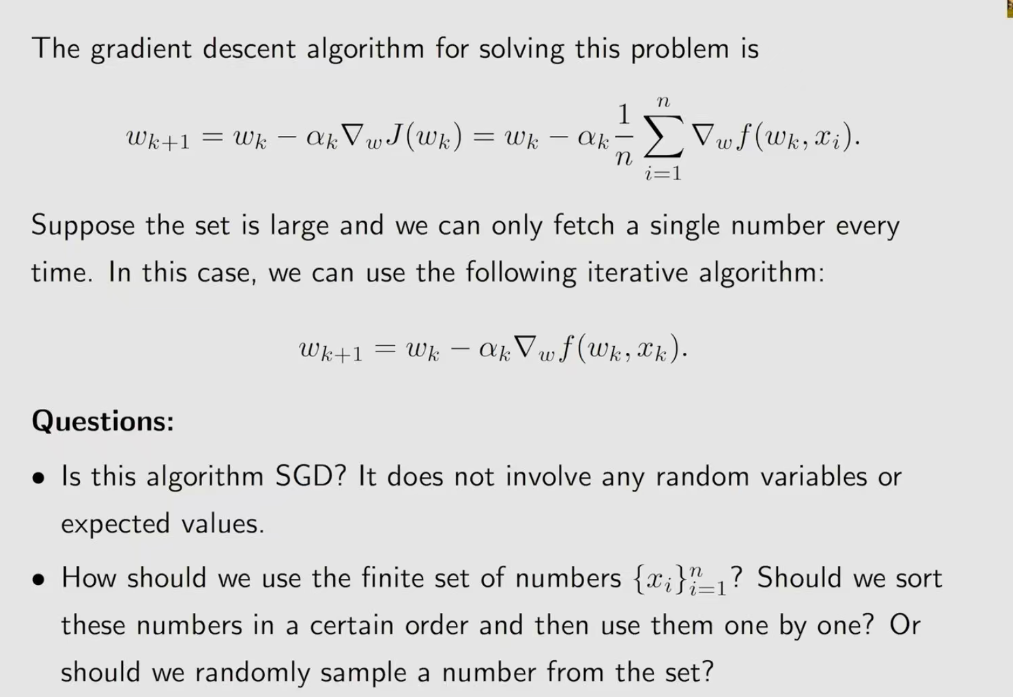 最后一个问题:有时候在SGD算法里面没有看到随机变量,而是一组数,他写成了和SGD类似的形式,这里面没有随机变量X,也没有期望,就是取平均,这时候还是SGD吗