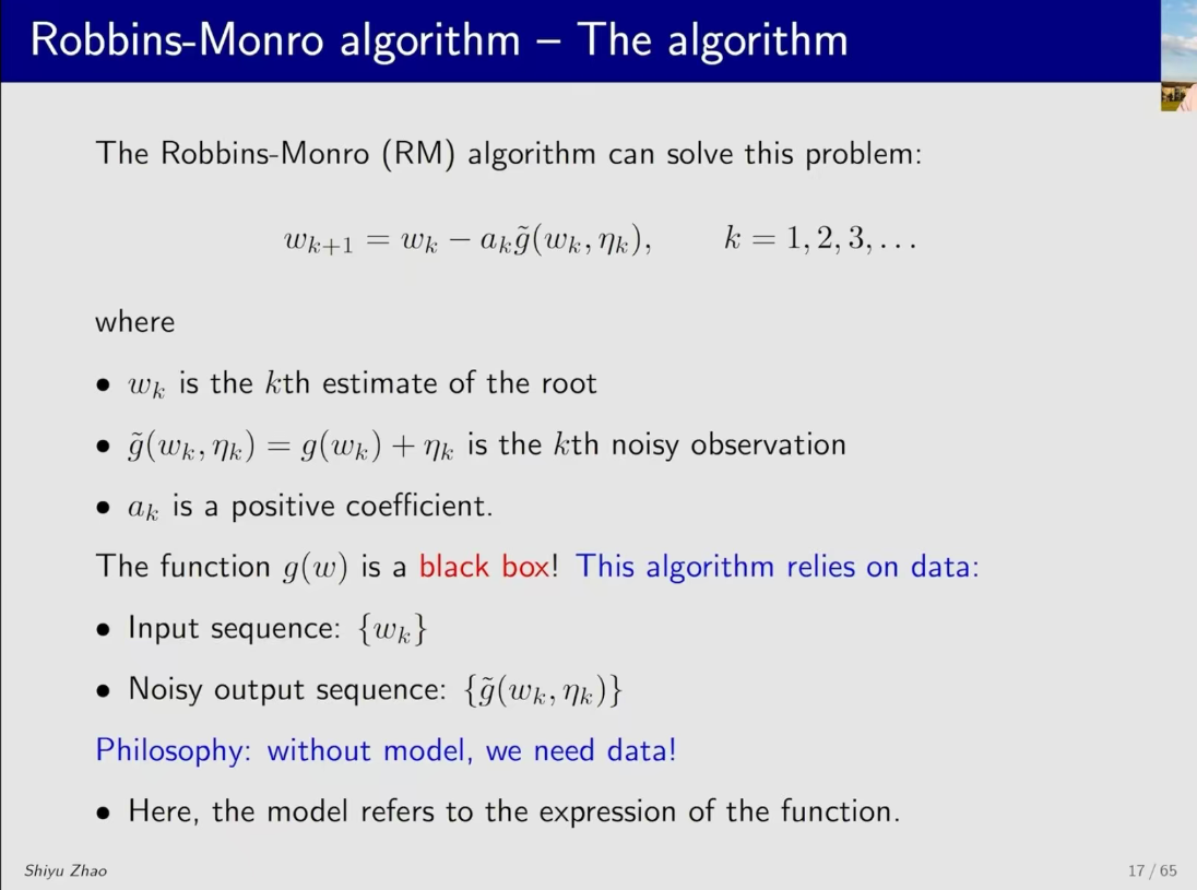 ②经典的rm算法:求g(w)=0的根,但是不知道g(w)的表达式,只知道每输入一个w能输出一个结果,可能是带误差的,这时候怎么求解