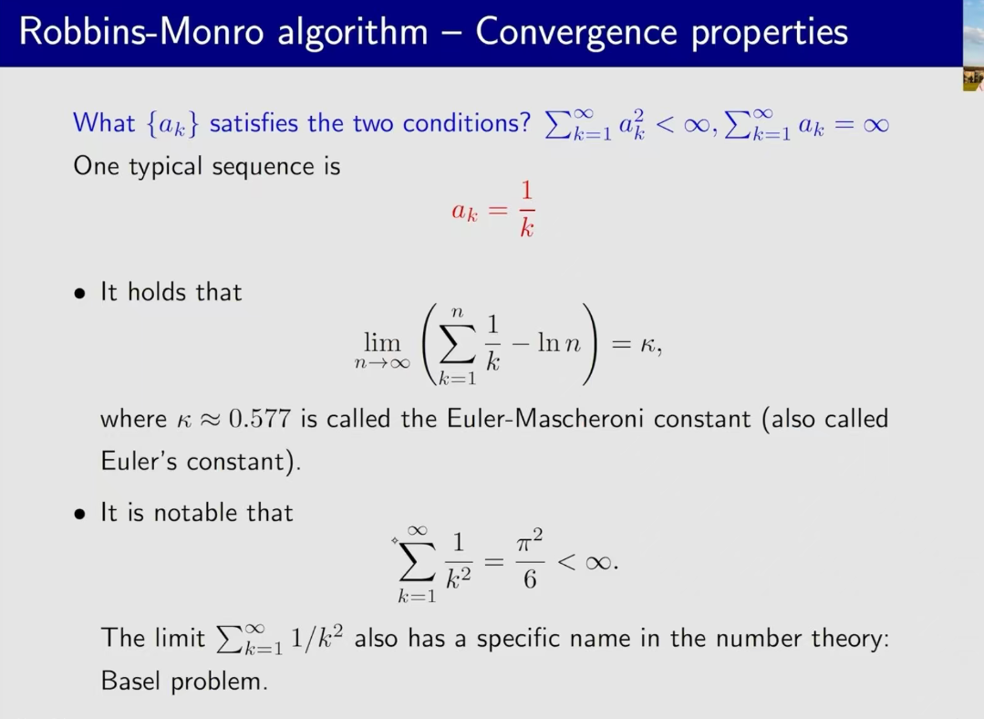 ak=1/k的时候是符合上述条件的一个解。证明就是那个p级数的证明。 但是实际问题里,不会取ak=1/k,而是取一个很小的常数。从而让后面进来的数据也能使用到
