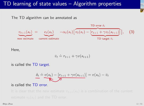 新的估计是由旧的估计加上修正项得到的。这个修正项后面的那部分(rt + 1 + γvt(st + 1))叫做td target,两个状态的差叫td error