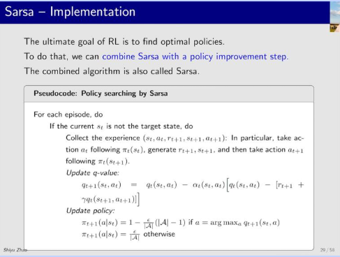 sarsa算法的伪代码如下(和策略改进过程结合) 策略改进的过程:还是和之前一样,用的epislon