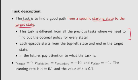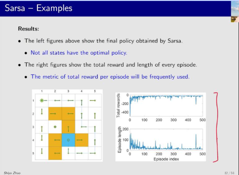 案例:sarsa算法走格子,找一条路径对应能走到终点的好状态,这个算法跑的结果如图所示,有几点必须要说: 第一点:不是所有状态都是最优的,探索比较少的地方,她的格子对应的策略不一定最优。 第二点:策略是不断在迭代中改进的,最开始好几百步猜得到目标,到后来就是几十步就能得到目标。