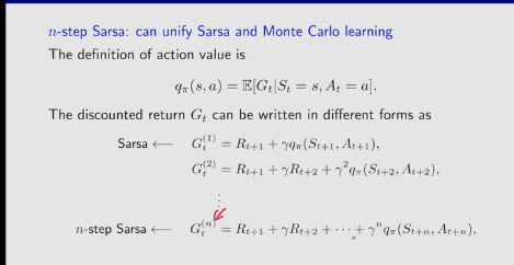 在q的定义里面,q是当前状态、动作条件下,能够获得的期望回报和。但是这个期望回报和是可以有多种定义的。 第一种定义就是sarsa的定义,只用一步的q迭代作为新的sarsa的值 第二种是迭代n步,用n步迭代的g作为新的q的估计 第三种就是迭代无穷步,对应mc算法