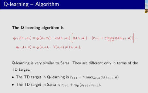 的区别在于,sarsa在算td target的时候需要把at + 1代进去算下一步的q,q-learning在计算td target