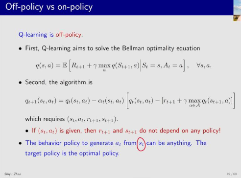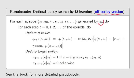 再来看q-learning,这是一个off-policy,它的原因是因为选动作的时候他是用maxq的策略去选,在更新模型的时候行为策略实际上是不依赖于连续轨迹的,可以通过##各种方式##采样得到。而目标策略是最优策略。这个时候,它的目标是最优策略,但是行为策略不依赖于这个最优策略,可以从任何策略中得到。
